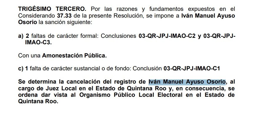 CHETUMAL, 12 de agosto.- El Instituto Nacional Electoral (INE) canceló el registro de la candidatura, y en consecuencia, la constancia de juez penal electo del Poder Judicial de Quintana Roo al abogado Iván Manuel Ayuso Osorio, por incumplir la entrega de sus informes de ingresos y gastos de campaña del pasado proceso electoral extraordinario para que fueran fiscalizados.