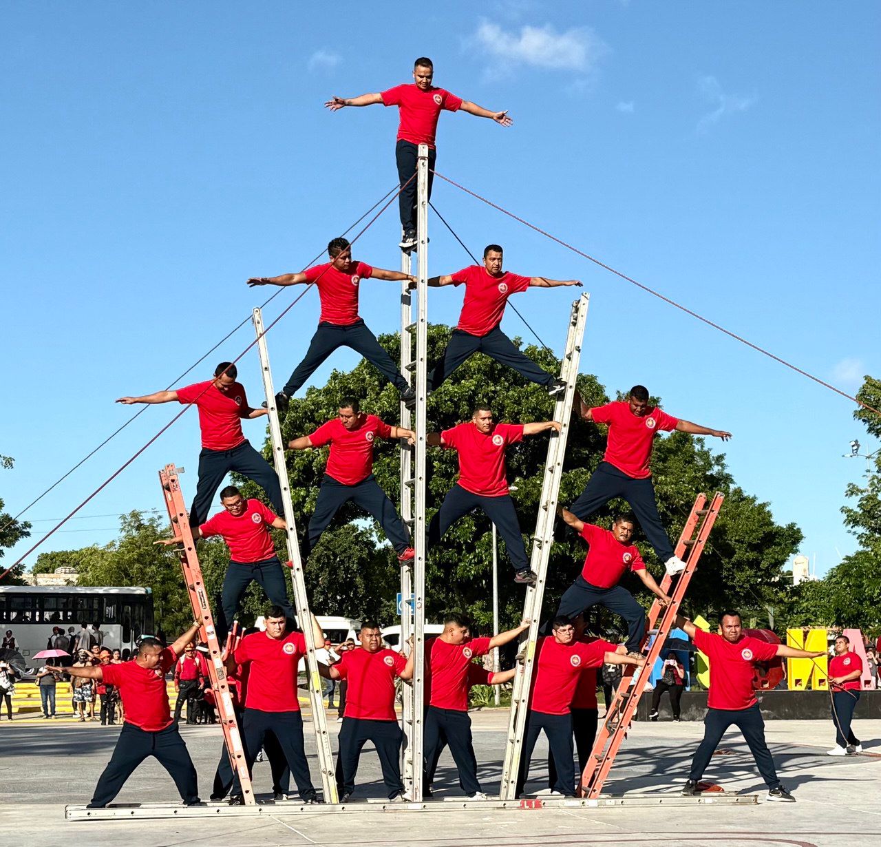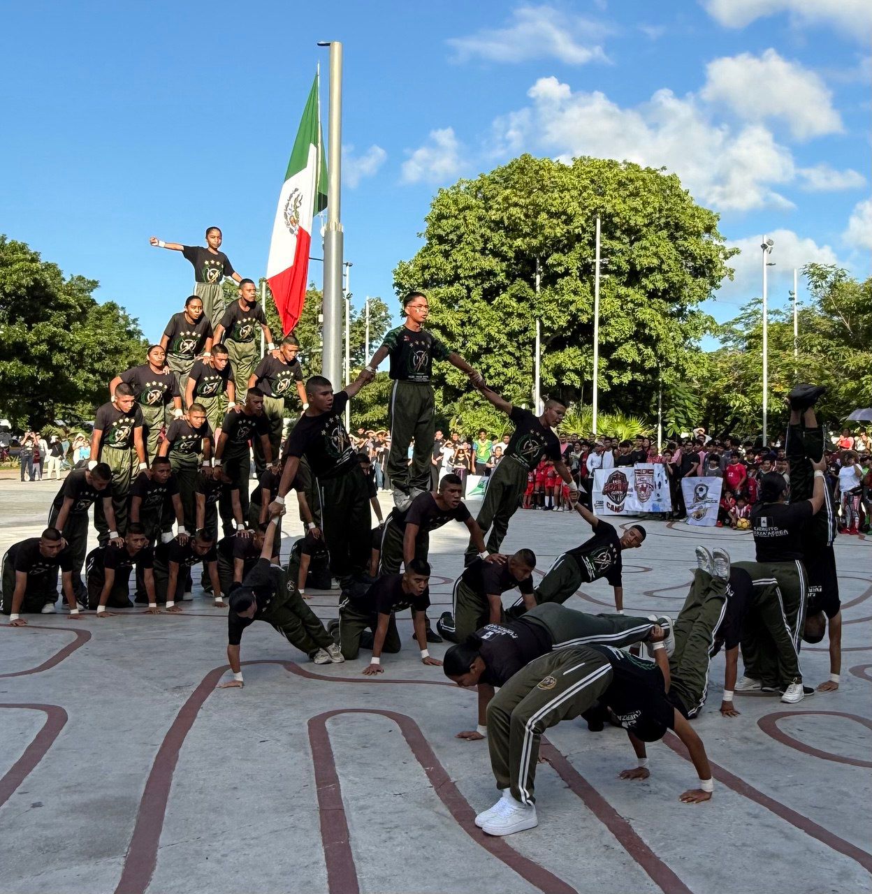 Tras el protocolo oficial, los asistentes disfrutaron de impresionantes exhibiciones que dieron vida al espíritu revolucionario. El 64° Batallón de Infantería del Ejército Mexicano abrió con una demostración marcial de precisión y gallardía; le siguieron los espectaculares movimientos coordinados de Pioneros de Cancún, el Escuadrón Deportivo Militarizado y Deportivo de Benito Juárez, Bomberos y la Policía Ciudadana, quienes sorprendieron con acrobacias, técnicas de rescate y despliegues de destreza física que encendieron el entusiasmo del público.