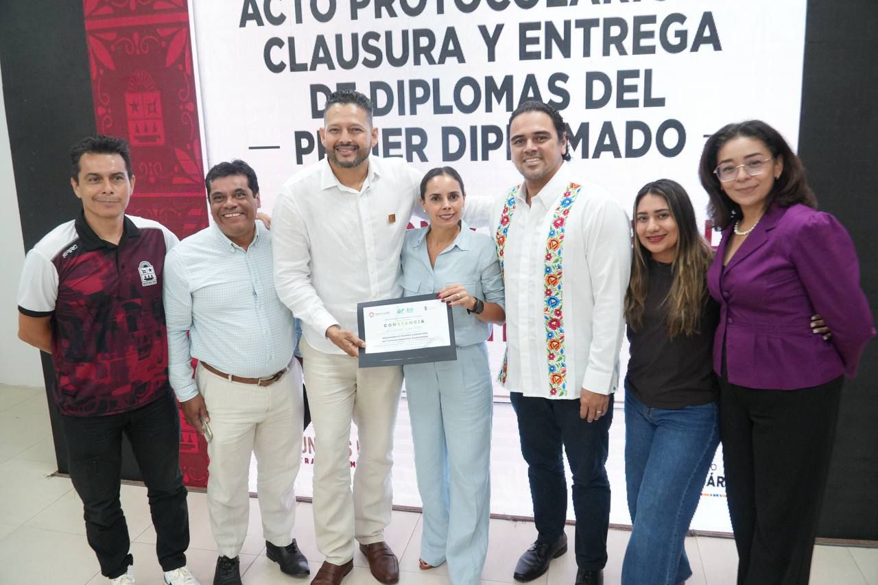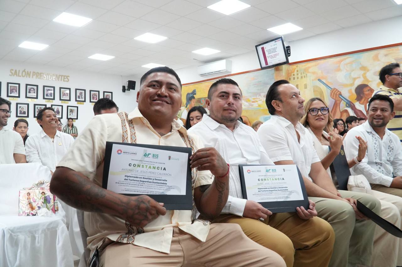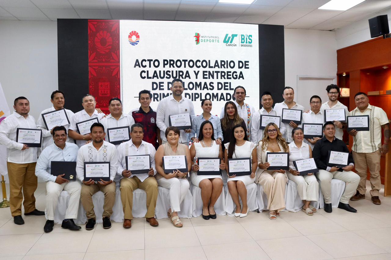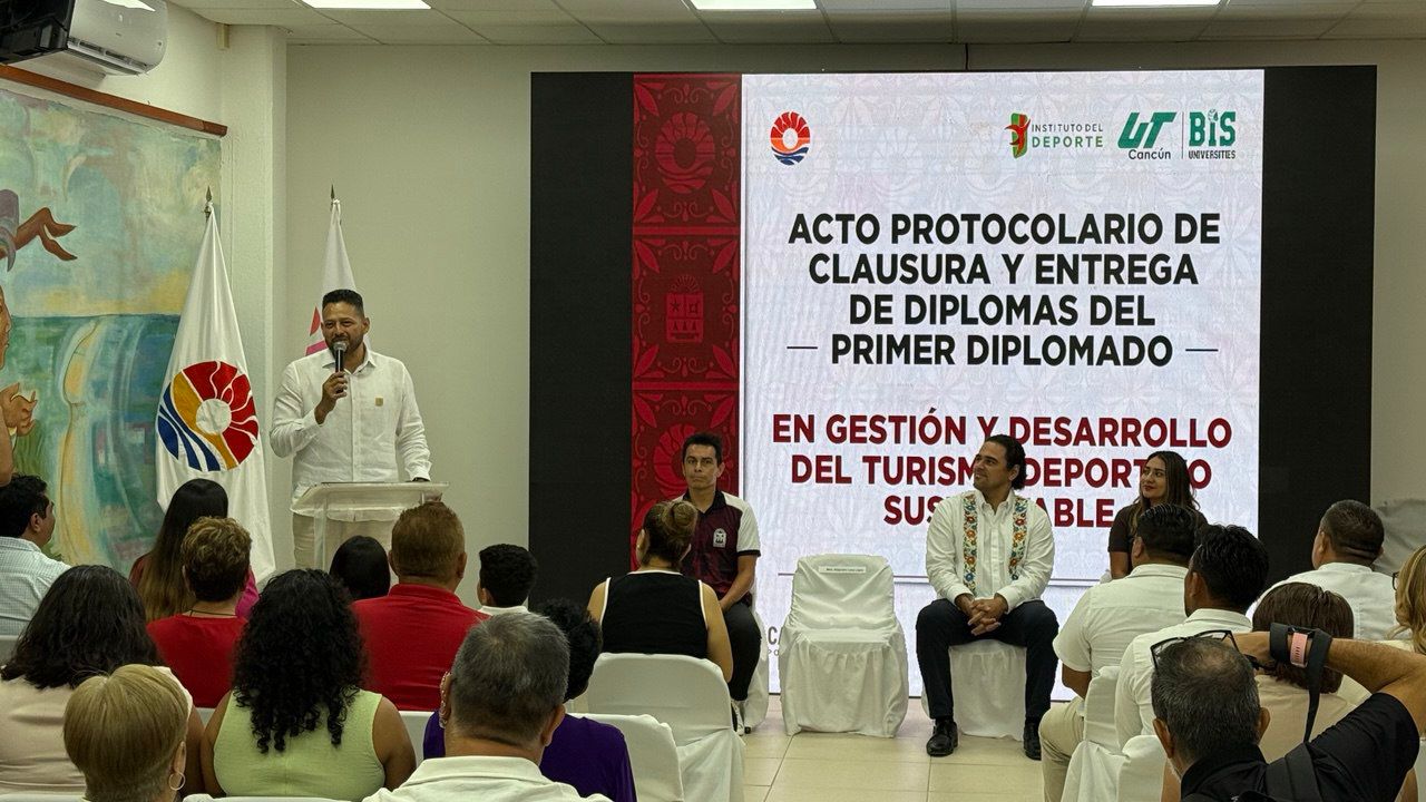 Cancún, Q. Roo a 24 de octubre.- Con el compromiso de seguir profesionalizando el deporte como motor de desarrollo económico y social, se llevó a cabo el acto protocolario de clausura y entrega de diplomas del 1er Diplomado en Gestión y Desarrollo de Turismo Deportivo Sustentable, impartido por la Universidad Tecnológica de Cancún (UT Cancún BIS), en colaboración con el Instituto Municipal del Deporte.