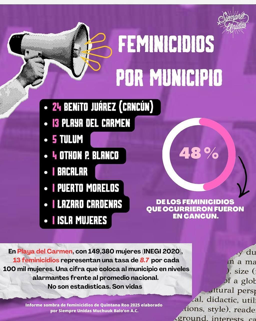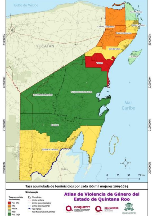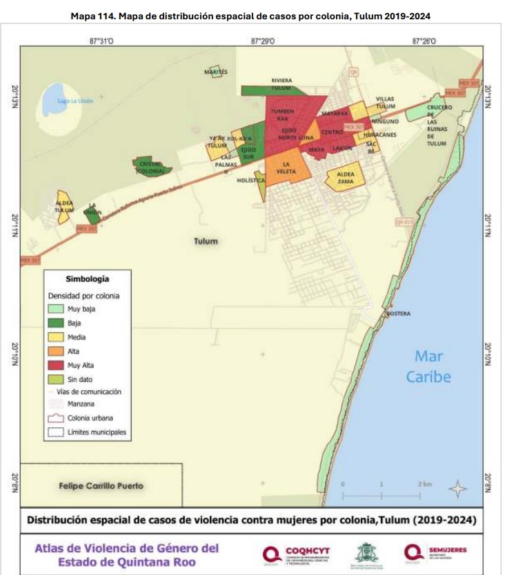 En el caso del Atlas de Violencia de Género 2019-2024 elaborado por la Uqroo, presentado en diciembre del 2025, señala que Tulum registra la mayor tasa de violencia letal contra mujeres en Quintana Roo, por lo que en cuanto al impacto de los feminicidios y homicidios dolosos se ubica al frente del estado; pero a pesar de eso no cuenta todavía con una Alerta de Violencia de Género que obligue a su negligente gobierno a ponerse en orden en la atención de este problema.