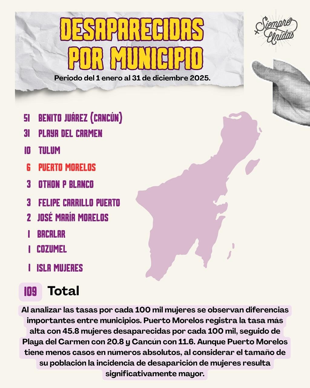 – Playa del Carmen, segundo lugar con 31 desaparecidas, el 28 % estatal.