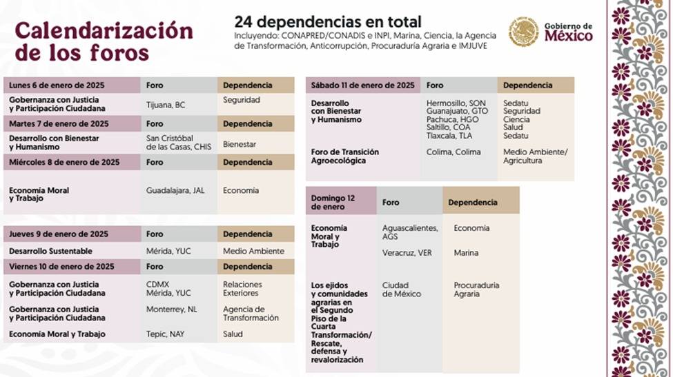 El sábado 11 de enero de 2025 se tendrán foros en Hermosillo, Sonora; Guanajuato, Guanajuato; Pachuca, Hidalgo; Saltillo, Coahuila; Tlaxcala, Tlaxcala; y Colima, Colima; y el domingo 12 de enero, en Aguascalientes, Veracruz y Ciudad de México, para concluir la primera semana.