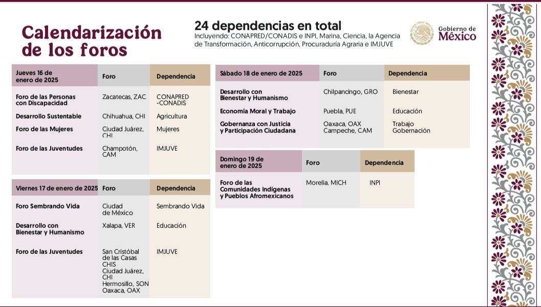 El 16 de enero se tendrán foros en Zacatecas; Chihuahua y Ciudad Juárez, Chihuahua; y Champotón, Campeche; y el 17 de enero, en la Ciudad de México; Xalapa, Veracruz; San Cristóbal de las Casas, Chiapas; Ciudad Juárez, Chihuahua; Hermosillo, Sonora; y Oaxaca, Oaxaca.