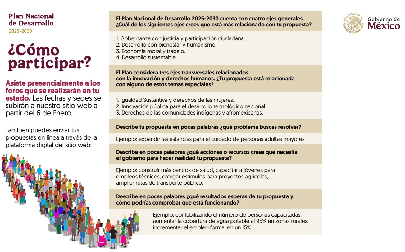 Las propuestas de la ciudadanía deben ser puntuales, describiendo el problema que busca resolver y con qué acciones del gobierno, además de detallar qué resultados se espera y cómo se comprobar que está funcionando.