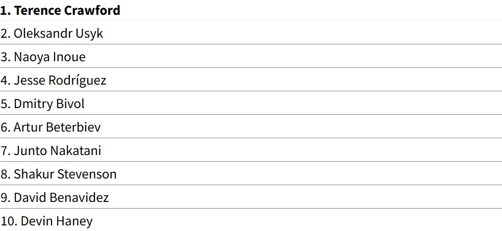Con su victoria ante ‘Canelo’ Álvarez, Terence Crawford (42-0-0, 31 nocauts) lidera el ranking. El estadunidense se llevó el triunfo con dos tarjetas de 115-113 y otra de 116-112, para convertirse en campeón indiscutido en tres divisiones