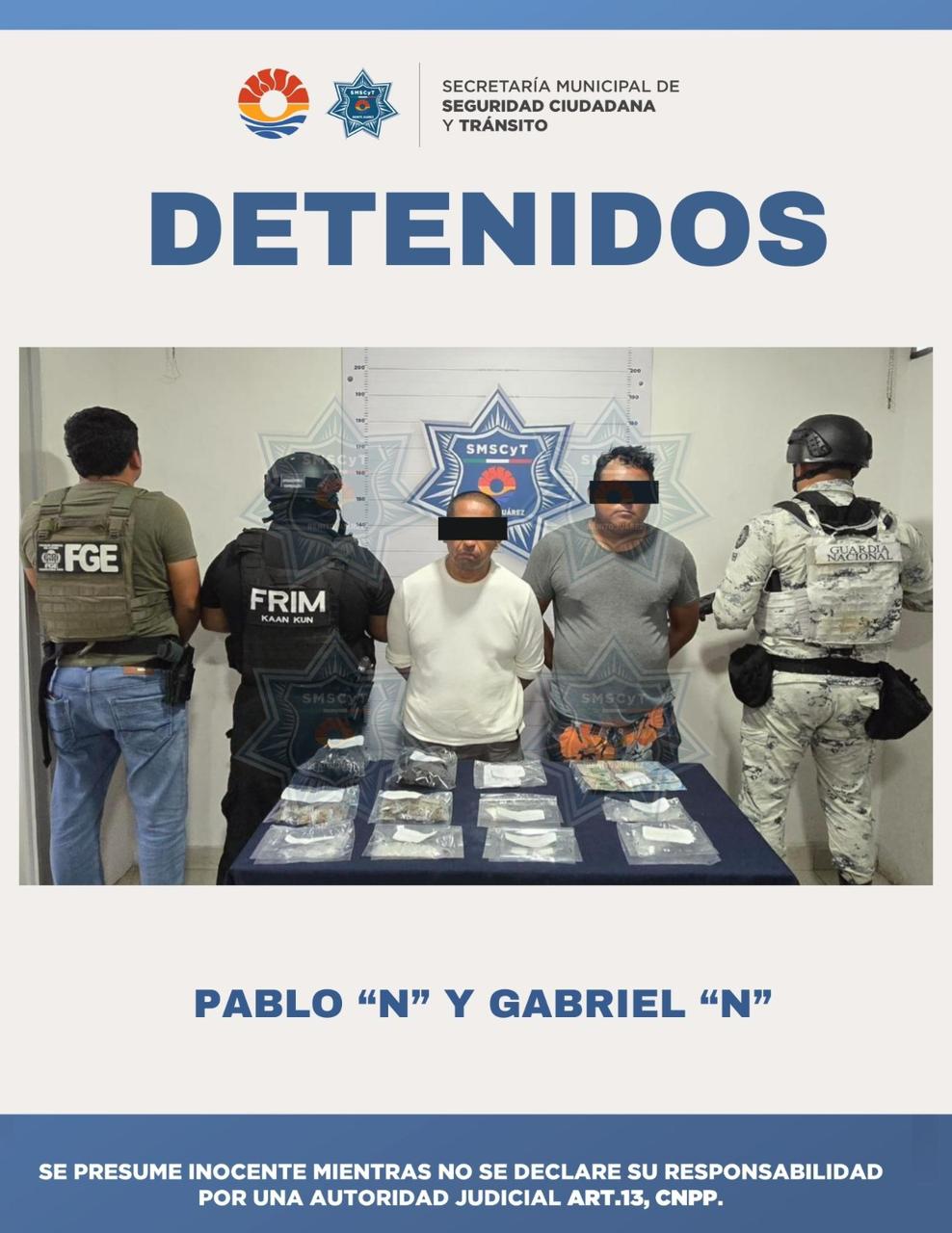 Cancún, 26 de septiembre.- En el marco del operativo “Blindaje Cancún”, fuerzas de seguridad lograron la detención de dos presuntos narcomenudistas en la Supermanzana 259, a quienes les fueron asegurados más de un centenar de dosis de diferentes tipos de narcóticos.