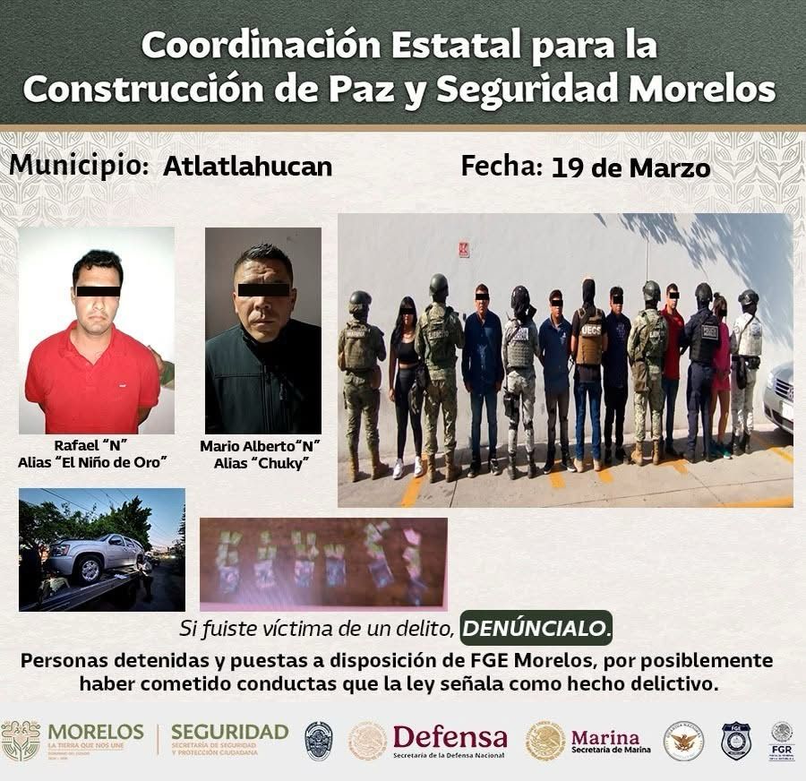 El operativo se llevó a cabo en el barrio de Santa Bárbara, en el municipio de Atlatlahucan, Morelos, donde también fueron detenidos: Mario Alberto “N”, alias “El Chuky”; Miguel Ángel “N”; Marco Antonio “N”, alias “Markia”; Mayra “N” (hermana del líder delictivo); y Carolina “N”, de nacionalidad colombiana.