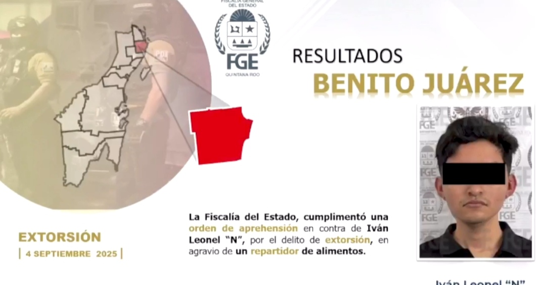 Cancún, 8 de septiembre.– La Fiscalía General del Estado informó la detención de Iván Leonel “N”, de 23 años y originario de Quintana Roo, acusado de extorsionar a un repartidor de comida que labora para una plataforma digital.