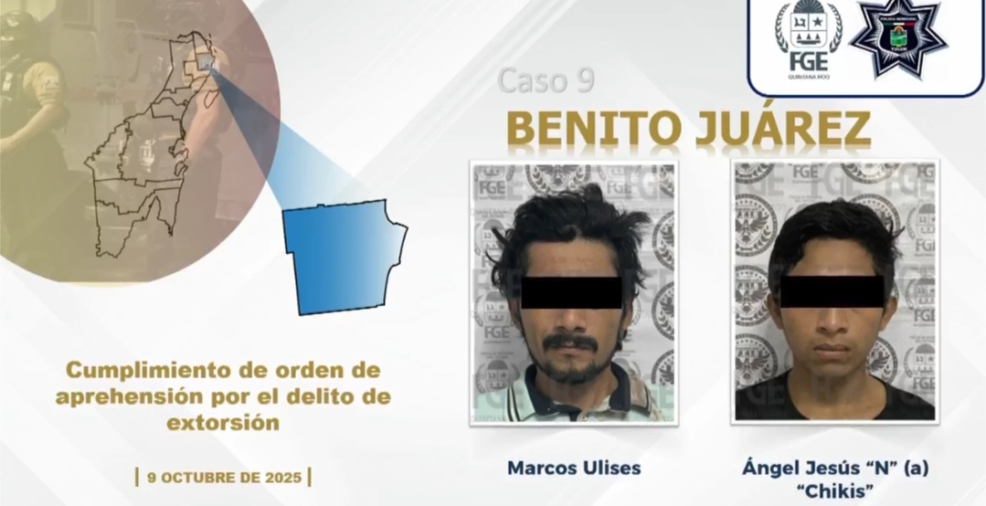 Cancún, 13 de octubre. – Una investigación por extorsión en un autolavado de la Supermanzana 228 llevó a la detención de dos medios hermanos y al aseguramiento de un arma de fuego que, según la Fiscalía, está vinculada con dos asesinatos recientes en la zona.