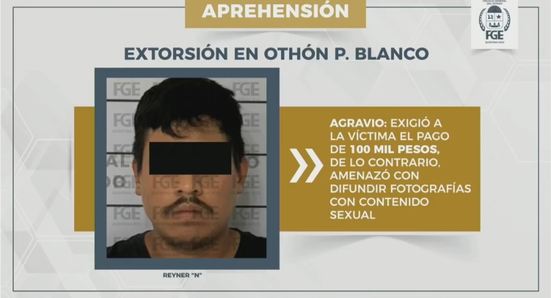 Cancún, 19 de enero. – El Fiscal General, Raciel López Salazar, dio a conocer durante la conferencia del gabinete de seguridad de este lunes, el cumplimiento de una orden de aprehensión en contra de Reiner N, de 23 años, quien es señalado por su probable participación en el delito de extorsión en contra de la propietaria de un hotel en el municipio de Benito Juárez.