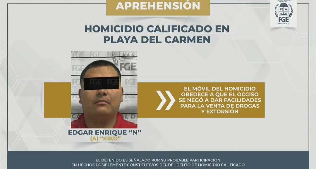 Playa del Carmen, 2 de marzo. – El fiscal Raciel López Salazar informó que elementos de la Policía de Investigación de la Fiscalía General del Estado cumplimentaron una orden de aprehensión en contra de un hombre identificado como Edgar Enrique N, alias Kiko, de 26 años de edad y originario de Tabasco.