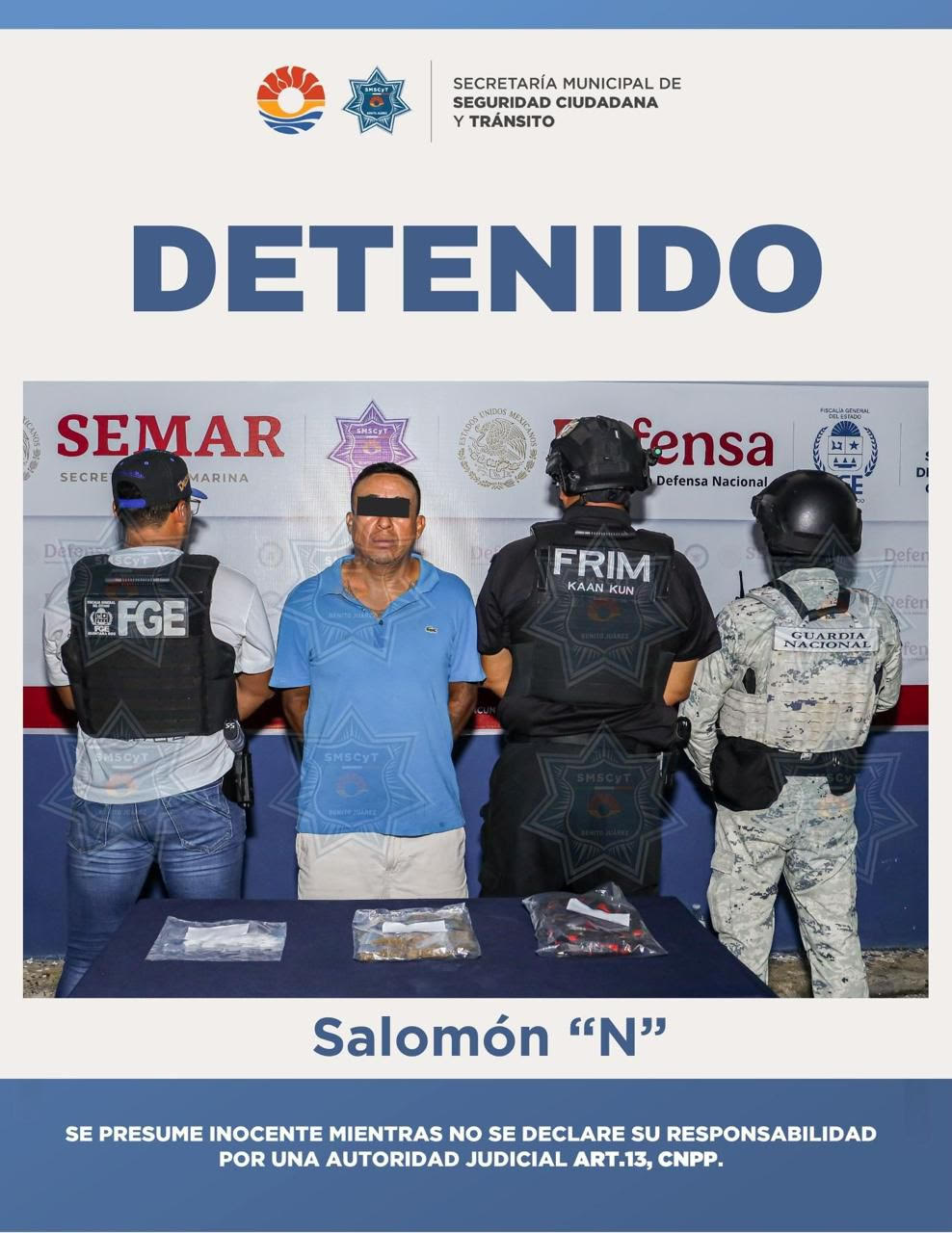 Cancún, 21 de octubre.- La Secretaría Municipal de Seguridad Ciudadana y Tránsito (SMSCyT) de Benito Juárez, en colaboración con la Fiscalía General del Estado (FGE) y autoridades federales, logró la detención de un sujeto identificado como Salomón “N“, presuntamente implicado en delitos contra la salud.