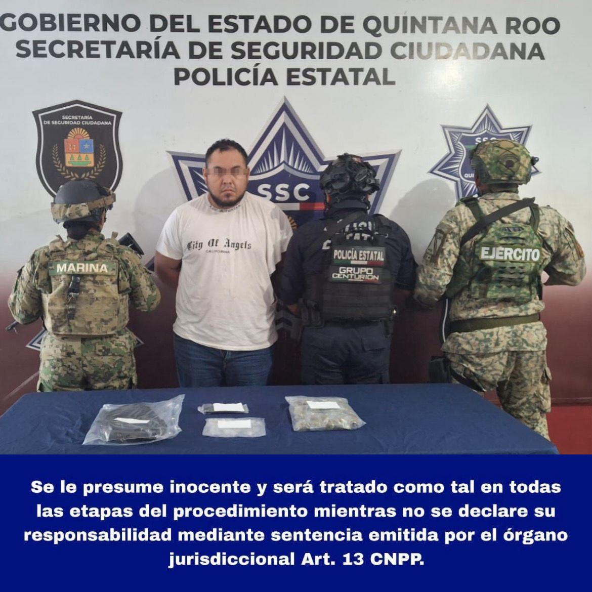 Cancún, 14 de enero. – En un operativo conjunto realizado por el Grupo Centurión de la Secretaría de Seguridad Ciudadana, en coordinación con la Secretaría de Marina y la Secretaría de la Defensa Nacional, se logró la detención de un hombre identificado como Marco Antonio N, por su presunta participación en delitos contra la salud en el municipio de Benito Juárez.