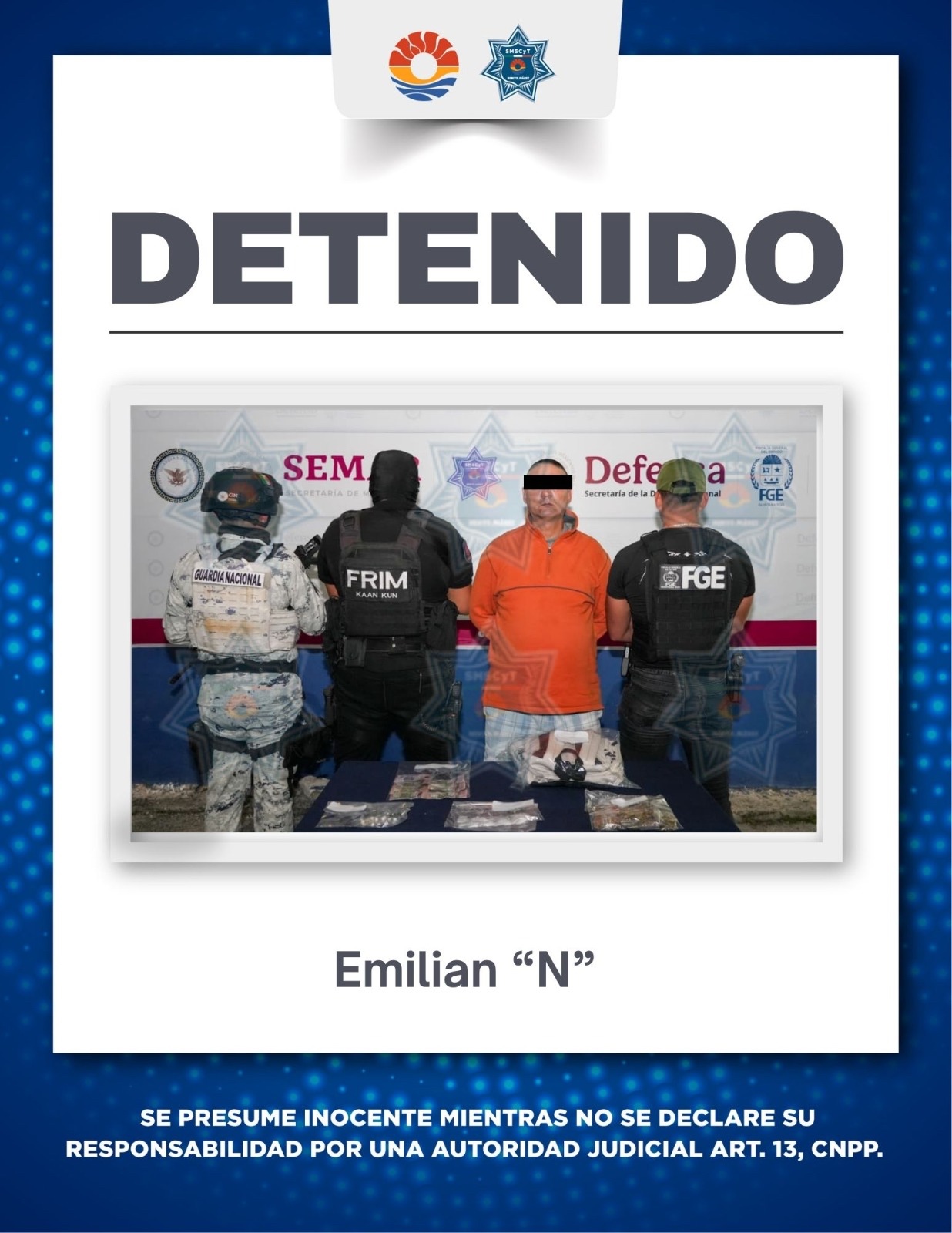 El detenido fue identificado como Emilian N, de 46 años de edad. Tras el hallazgo de los narcóticos, fue trasladado y puesto a disposición de la Fiscalía General del Estado, donde se iniciaron los trámites legales para determinar su situación jurídica.
