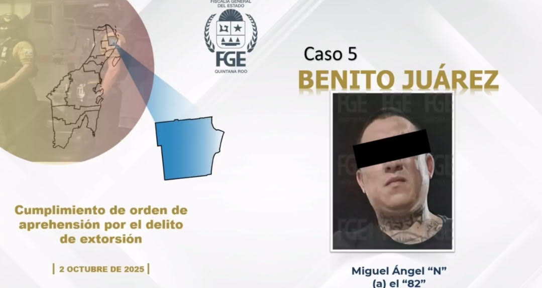 Cancún, 6 de octubre.— La Fiscalía General del Estado (FGE) de Quintana Roo, a través de la Policía de Investigación, cumplimentó una orden de aprehensión contra Miguel Ángel “N”, alias “El 82”, de 32 años y originario de Quintana Roo, por el delito de extorsión en agravio de un empresario turístico en la zona hotelera de Cancún.