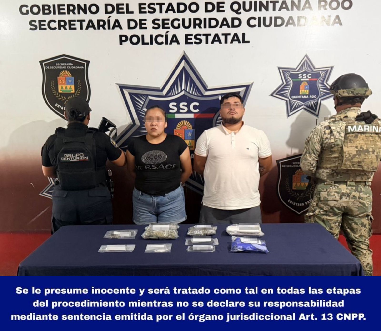 Cancún, 31 de octubre. – En una acción coordinada entre el Grupo Centurión de la Secretaría de Seguridad Ciudadana (SSC) y elementos de la Secretaría de Marina (SEMAR), fue detenida una pareja en Cancún por su presunta participación en delitos contra la salud. Los detenidos fueron identificados como Jared Yasser “N” y Adanely Yanet “N”.