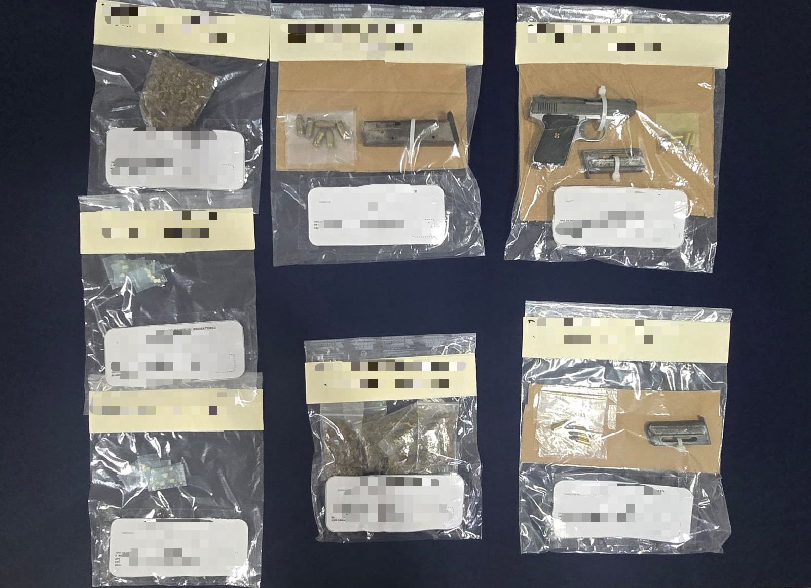 Tras la revisión correspondiente, a los sujetos les fueron decomisados una bolsa de plástico y siete bolsitas tipo ziploc, todas con presunta marihuana, nueve bolsitas de plástico transparente de color azul con fragmentos sólidos con características del crack, un arma tipo pistola de color plateado con empuñadura negra, calibre .22 mm; tres cargadores metálicos que contenían un total de 15 cartuchos útiles de calibres .22 mm y .38 mm y el vehículo marca Ford tipo Focus de color azul oscuro, que circulaba sin placas de circulación.