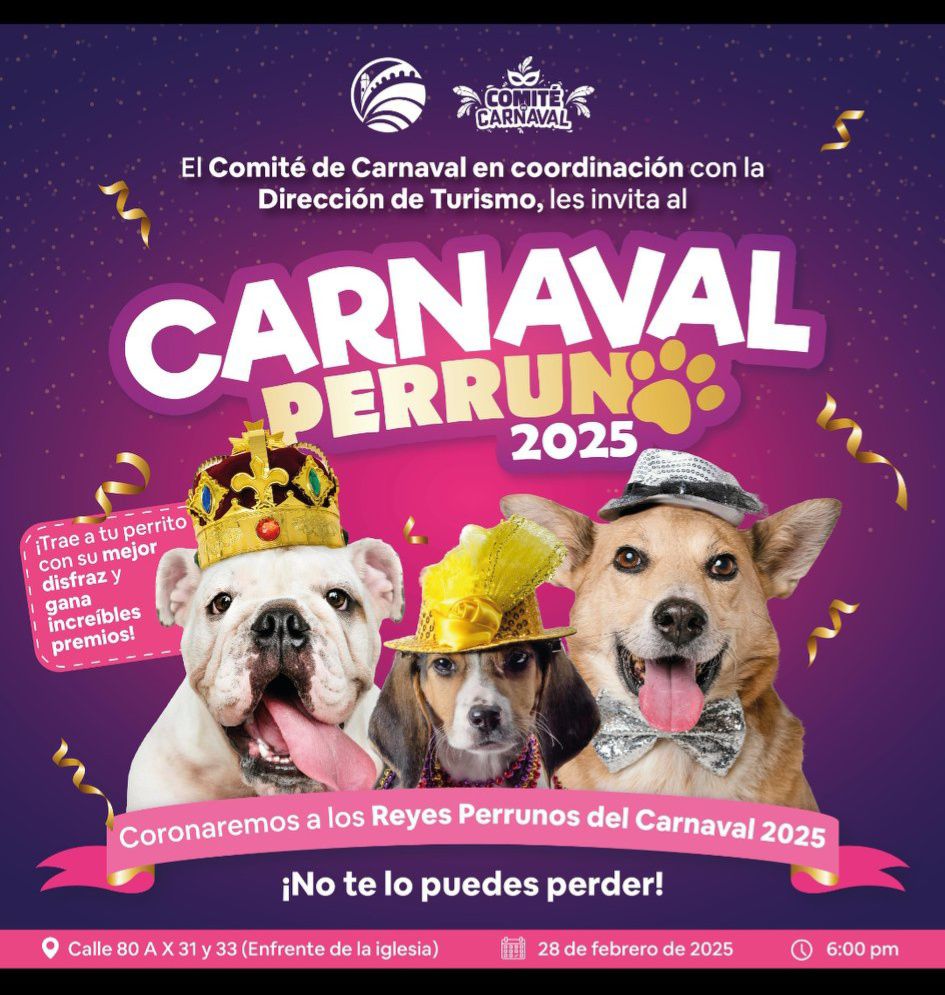 En el festival el comité del Carnaval de Progreso 2025 en coordinación con la dirección de Turismo realizará el concurso del disfraz más original para la esperada “Coronación Perruna”.