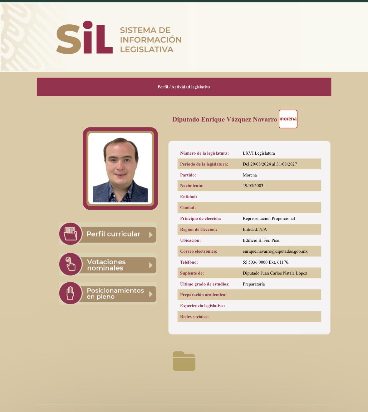 El diputado federal plurinominal Enrique Vázquez es el más joven del país y pertenece a Morena, apenas cuenta con 22 años y solo tiene estudios de preparatoria.