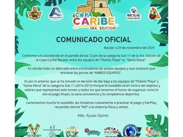 29 Nov. 2025Suspenden a dos equipos de la Copa Caribe tras zafarrancho entre ellos. Ricardo Jesús Rivas/ CAMBIO 22 BACALAR, 29 de noviembre. – Lo…