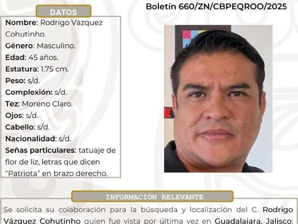 3 Sep. 2025Redacción / CAMBIO 22 Cancún, 3 de septiembre.- La desaparición de Rodrigo Vázquez Coutiño, conocido como “El Patriota”, mantiene en vilo a la ciudadanía…