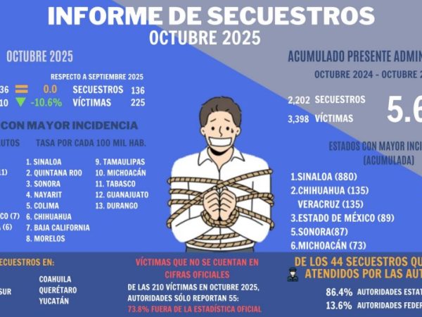23 Nov. 2025La asociación civil Alto al Secuestro reporta 11 eventos de secuestro en ese mes en el estado, 6 más que en septiembre, para un…