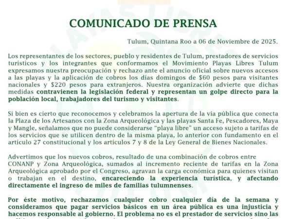 Movimiento Playas Libres Tulum Rechaza Cobros en el Acceso a Playas y Convocan a Manifestación Pacífica