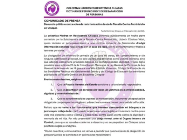 30 Sep. 2025La colectiva denunció que durante el acompañamiento a una víctima indirecta del caso de Jade, la funcionaria compartió datos confidenciales frente a terceros, vulnerando…