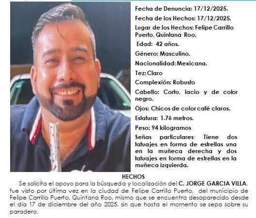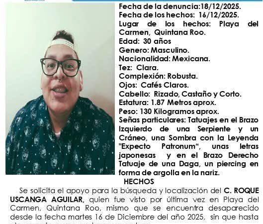 19 Dic. 2025Redacción / CAMBIO22 Playa del Carmen, 19 de diciembre.- La comunidad de Playa del Carmen se encuentra en alerta tras la desaparición de Roque…