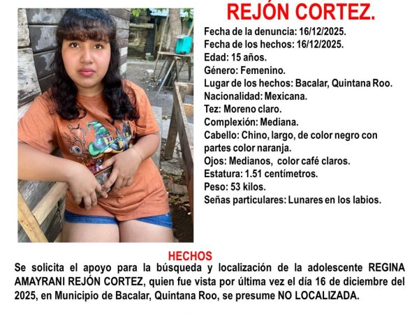 18 Dic. 2025La Fiscalía de Quintana Roo activó la Alerta Amber por la desaparición de Regina Amayrani Rejón Cortez, de 15 años, vista por última…