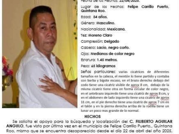 Más Desapariciones en Felipe Carrillo Puerto: FGE Actualiza Ficha de Búsqueda de Filiberto Aguilar Angulo