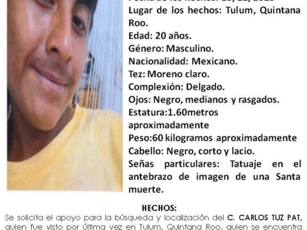 18 Dic. 2025Según la descripción proporcionada por la autoridad, Carlos Tuz Pat es de nacionalidad mexicana, complexión delgada, tez morena clara, mide aproximadamente 1.60 metros y…