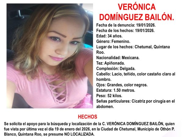 20 Ene. 2026La Fiscalía activó el Protocolo Alba para localizar a Verónica Domínguez Bailón, de 34 años, privada de su libertad en Chetumal; el caso encendió…