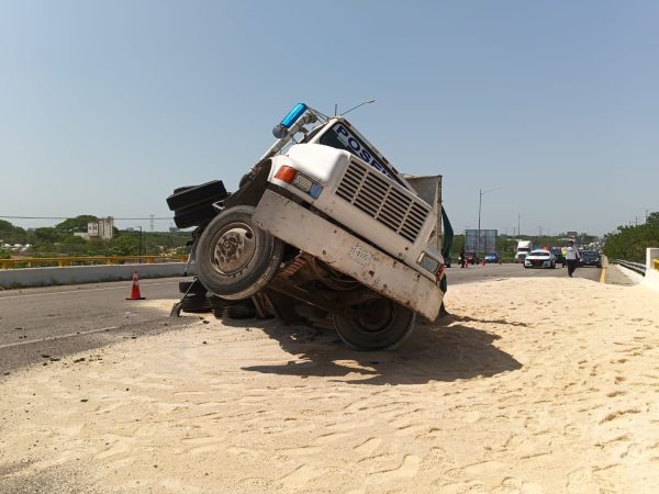 Pesada Unidad Cargada con Toneladas de Arena Volcó Sobre el Puente de Xcanatún en la Mérida-Progreso