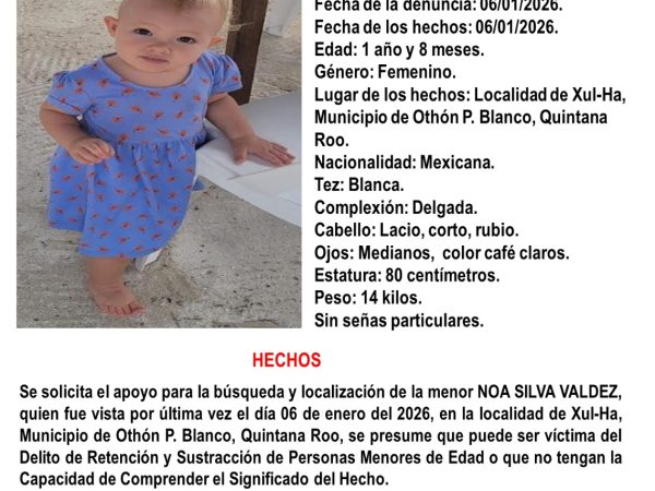 12 Ene. 2026Activan Alerta Amber en Quintana Roo por la desaparición de una menor de un año ocho meses en Xulhá, municipio de Othón P. Blanco;…