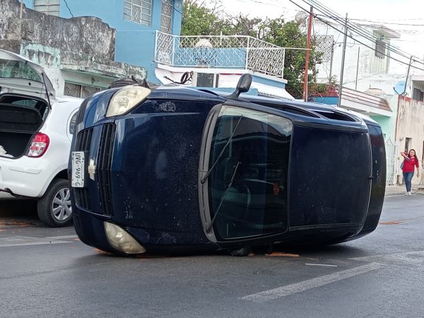 Vuelca al Impactarse Contra un Auto Estacionado en el Sur de Mérida