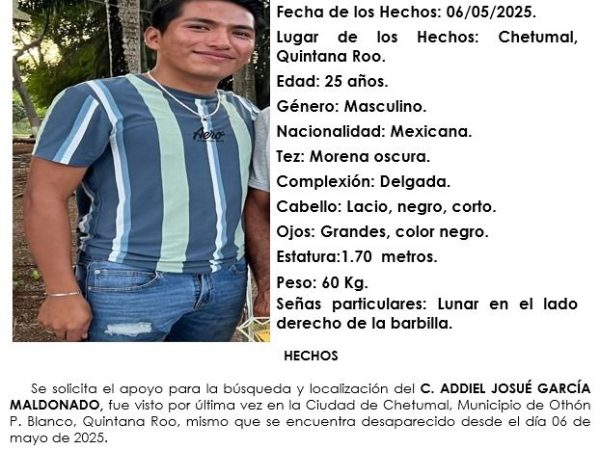 8 May. 2025La Fiscalía busca a Addiel Josué García Maldonado, desaparecido en Chetumal desde el 6 de mayo. Ciudadanos pueden reportar cualquier dato sobre su paradero…