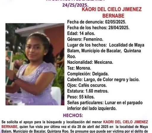 6 May. 2025Kaori del Cielo Jiménez Bernabé desapareció en Maya Balam el 28 de abril. La Fiscalía activó ficha de búsqueda y solicita apoyo…