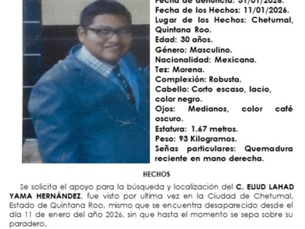 1 Feb. 2026La Fiscalía General del Estado de Quintana Roo emitió una alerta de búsqueda para localizar a Eliud Lahad Yama Hernández, desaparecido desde el 11…