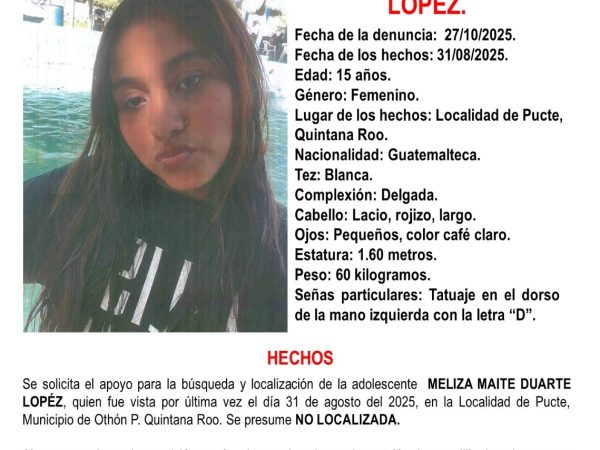 30 Oct. 2025Meliza Maite Duarte López, adolescente guatemalteca de 15 años, desapareció en Pucté el 31 de agosto. La Fiscalía de Quintana Roo activó su ficha…