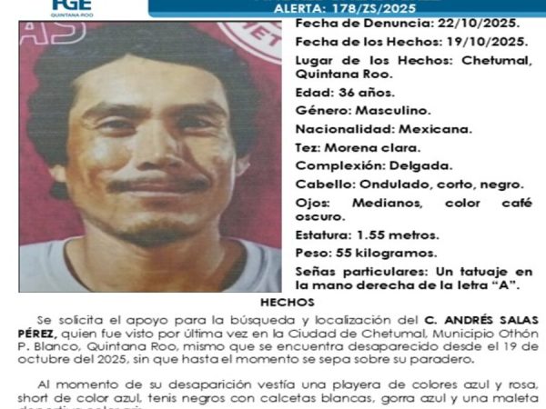 25 Oct. 2025La Fiscalía General del Estado de Quintana Roo busca a Andrés Salas Pérez, de 36 años, desaparecido desde el 19 de octubre en Chetumal.…
