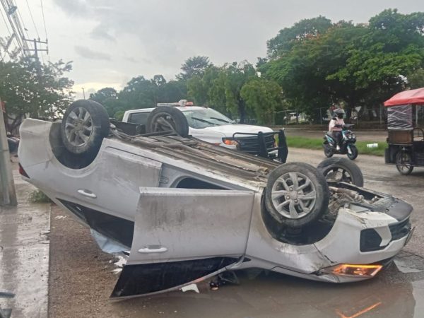 Piso Mojado Provoca Choque en el Bulevar Colosio y un Conductor se Da a la Fuga Tras Volcadura en la Av. Kabah