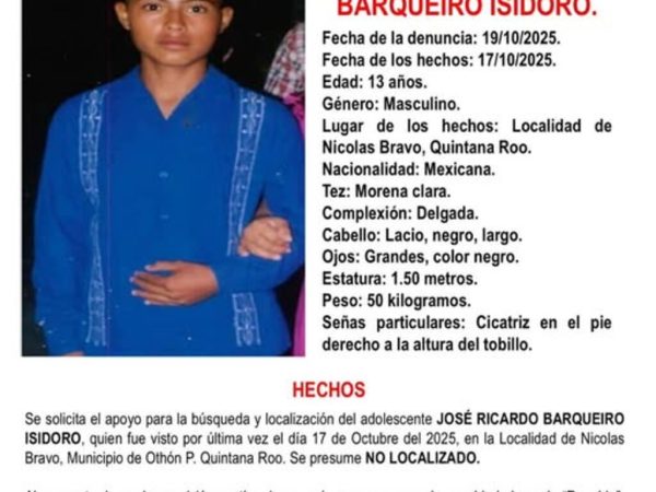 20 Oct. 2025La Fiscalía General del Estado de Quintana Roo emitió una Alerta Amber para dar con el paradero de José Ricardo Barqueiro Isidoro, de 13…