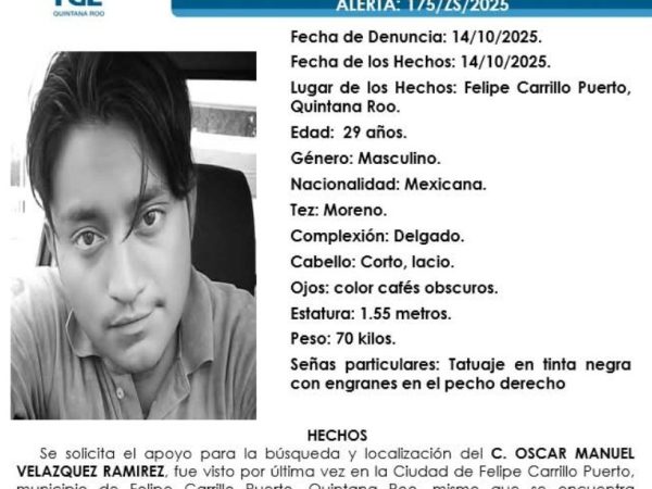 Activan Ficha de Búsqueda por Desaparición de Joven en Felipe Carrillo Puerto