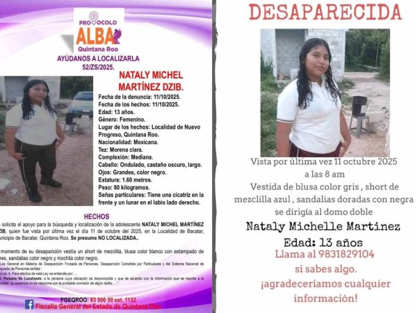 12 Oct. 2025La Fiscalía activó el Protocolo Alba por la desaparición de Nataly Michel Martínez Dzib, de 13 años, vista por última vez el 11 de…