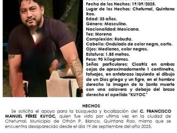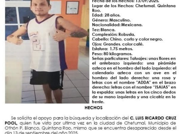 21 Sep. 2025La Fiscalía de Quintana Roo busca a Luis Ricardo Cruz Pool, de 28 años, desaparecido en Chetumal desde el 13 de septiembre. Presenta…
