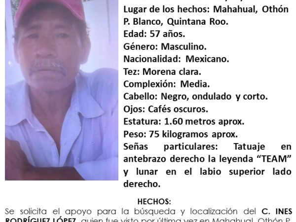 26 Nov. 2025La Fiscalía activó la ficha de localización de Inés Rodríguez López tras denuncia por desaparición en Mahahual. Familia pide apoyo ciudadano y cuestiona el…
