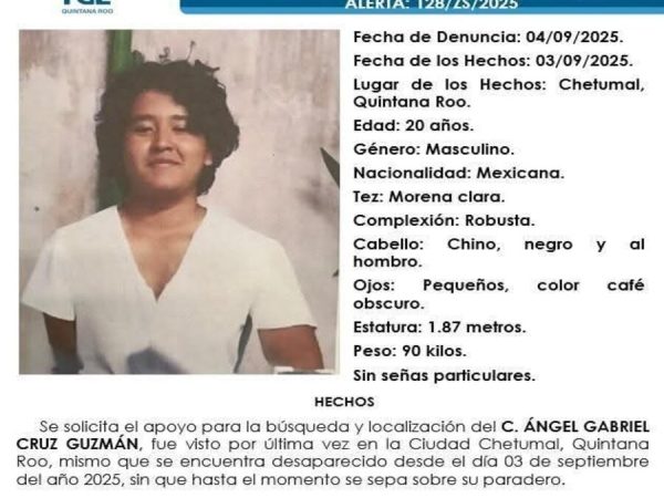 6 Sep. 2025La Fiscalía de Quintana Roo busca a Ángel Gabriel Cruz Guzmán, joven desaparecido en Chetumal desde el 3 de septiembre. Piden apoyo ciudadano y…