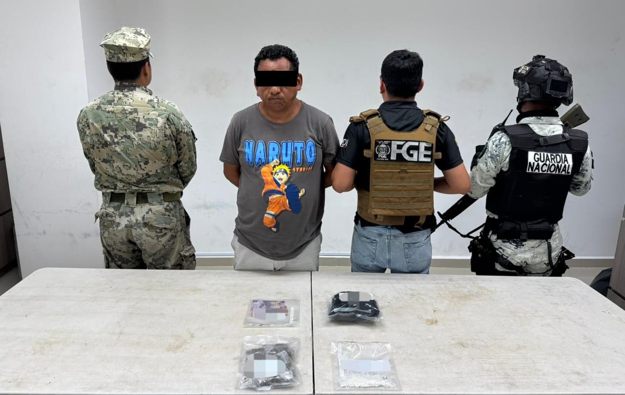 Durante el operativo fue detenido un hombre identificado como Óscar “N” y se aseguraron diversas sustancias con características similares a la marihuana y metanfetamina.