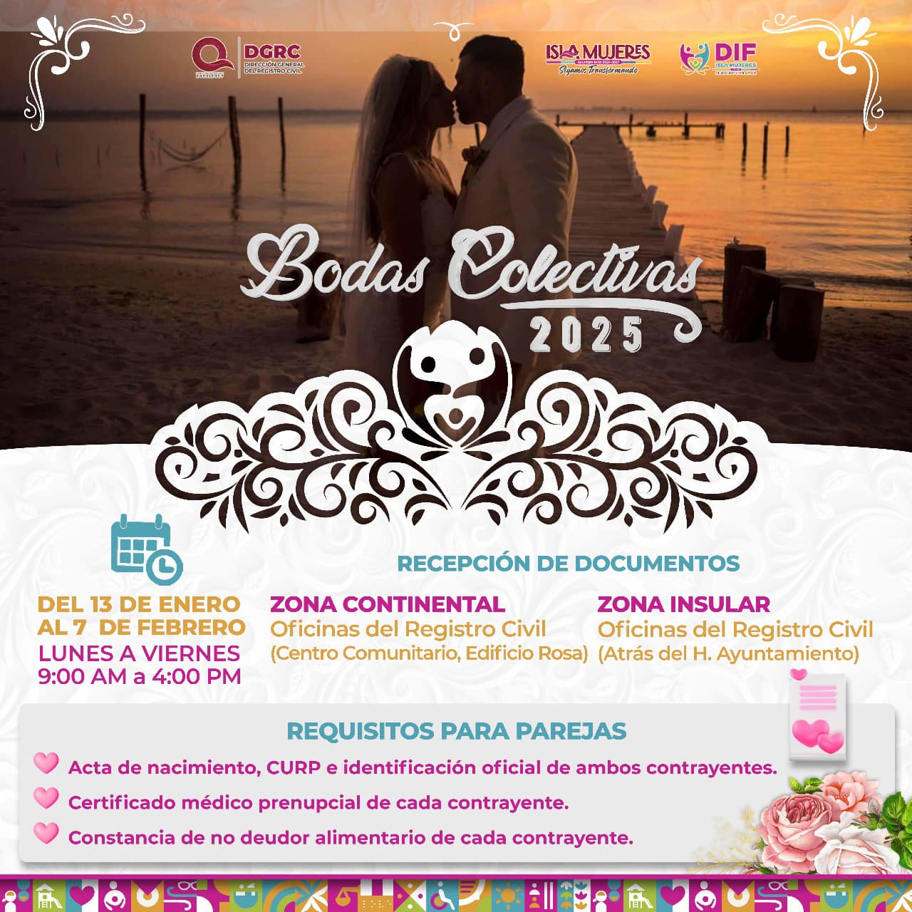 ISLA MUJERES, Q.ROO, 16 de enero-. Con el objetivo de ofrecer certeza jurídica a las parejas que desean formalizar su unión, el Gobierno municipal promueve, un año más, a través del DIF municipal y el Registro Civil, las Bodas Colectivas, que se celebrarán en febrero, mes del Amor y la Amistad.